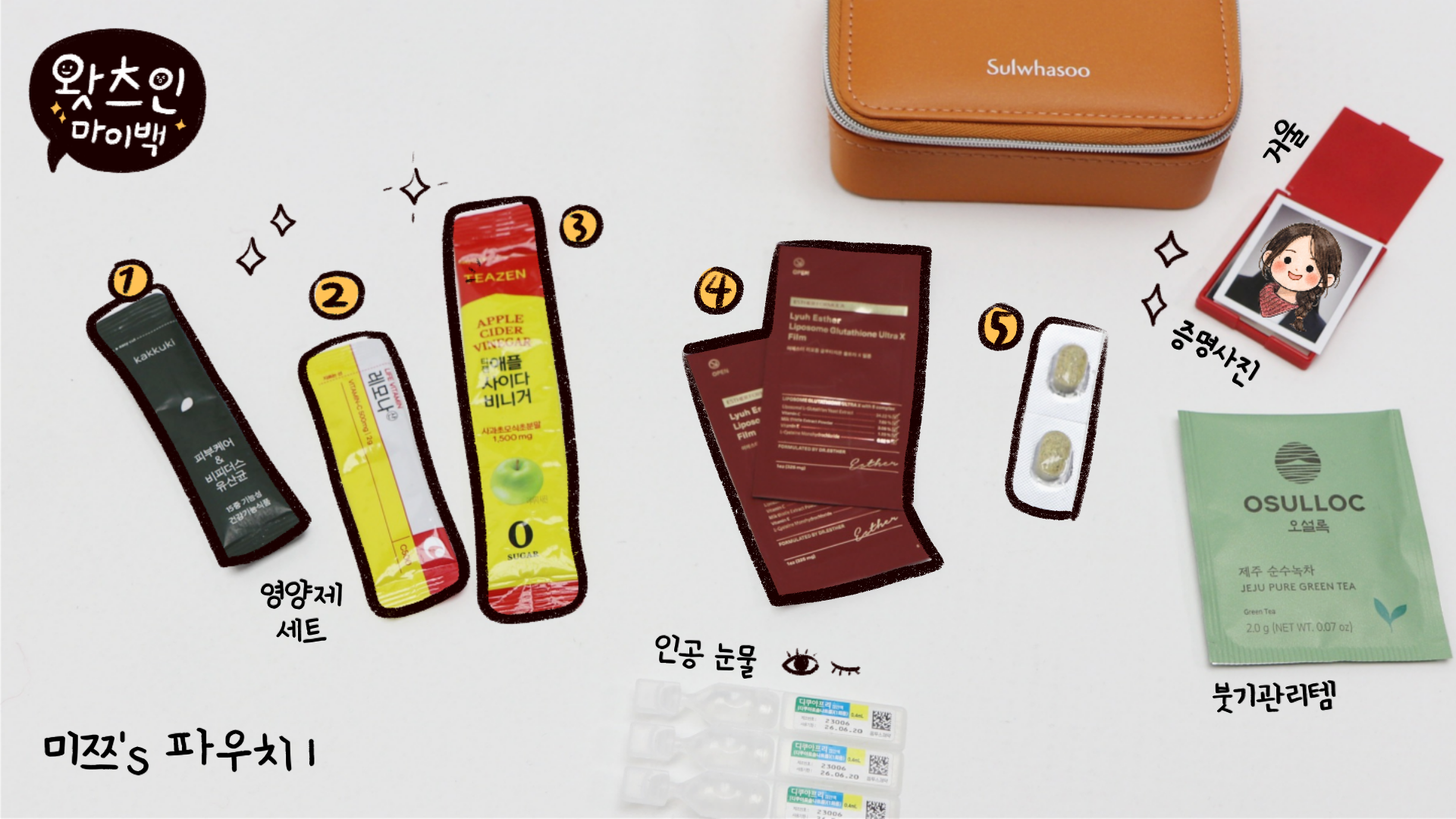 - 👝 파우치가 2개인 이유: 정리정돈에는 영 젬병인지라, 파우치가 없으면 가방에 모든 걸 다 때려넣어서 물건 찾는 데에 한 세월이 걸리거든요. 안되겠다 싶어, 필수템을 담는 큰 파우치와 자주 꺼내는 영양제와 미니거울 등을 담는 작은 파우치를 각각 들고다닙니다 ㅎㅎㅎ