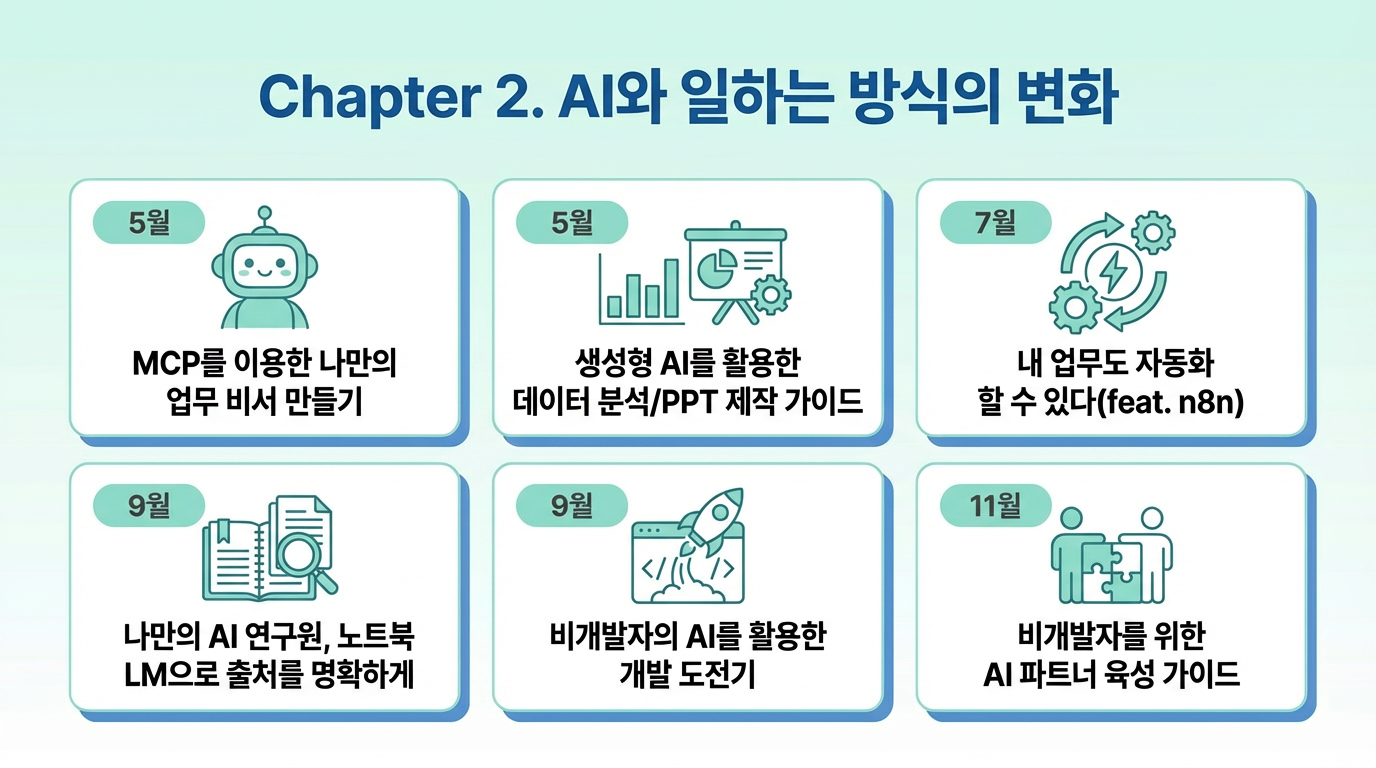 혼자만의 고민에서 시작된 질문들 업무에 몰두하다 보면 문득 이런 생각이 스쳐 지나간다. ‘다른 사람들은 어떻게 일하고 있을까?’ ‘나만 뒤처지고 있는 것은 아닐까?’ ‘그들은 어떤 방식으로 성장하고 있는 걸까?’ 특히 AI가 일상화된 현재, 전문적으로 AI를 다루지 않는 직무라면 더욱 막연한 불안감이 존재한다. 이런 궁금증을 해결하기 위해 온라인 커뮤니티나 오프라인 세미나를 찾아보지만, 우리 회사 상황과는 거리가 멀거나 […]