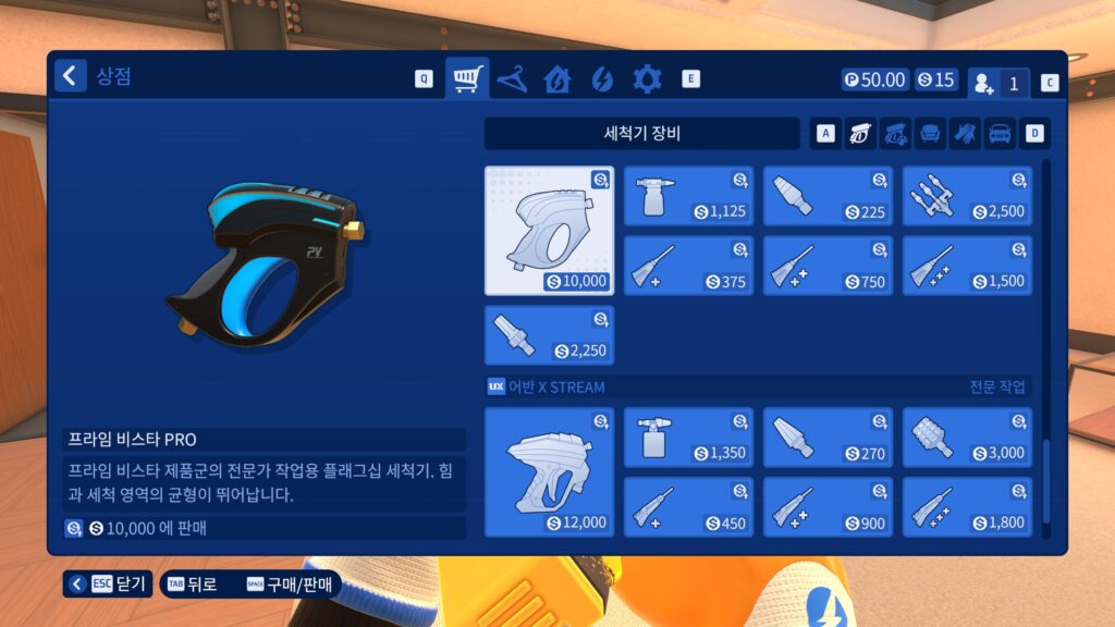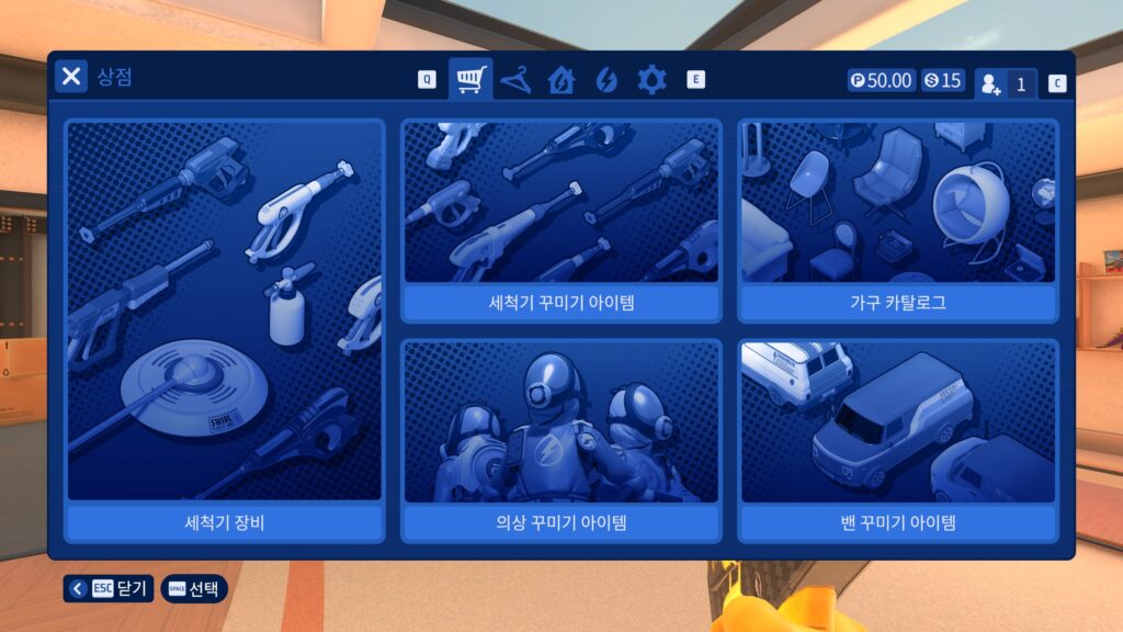 클리닝 장비의 전문성도 한층 깊어졌다. 물청소기와 세척액으로 단순하게 나뉘던 1편과 달리, 2편에서는 물청소 장비 2종과 바닥 청소 전용 장비 1종으로 세분화됐다. 물청소 장비만 해도 넓은 구역을 낮은 수압으로 빠르게 훑는 방식과 좁은 구역에 강력한 수압을 집중하는 방식 중 유저가 상황에 맞게 골라 쓸 수 있다. 여기에 새로 추가된 바닥 전용 세척 장비는 광활한 지면의 오염을 단숨에 쓸어내는 쾌감을 선사한다.