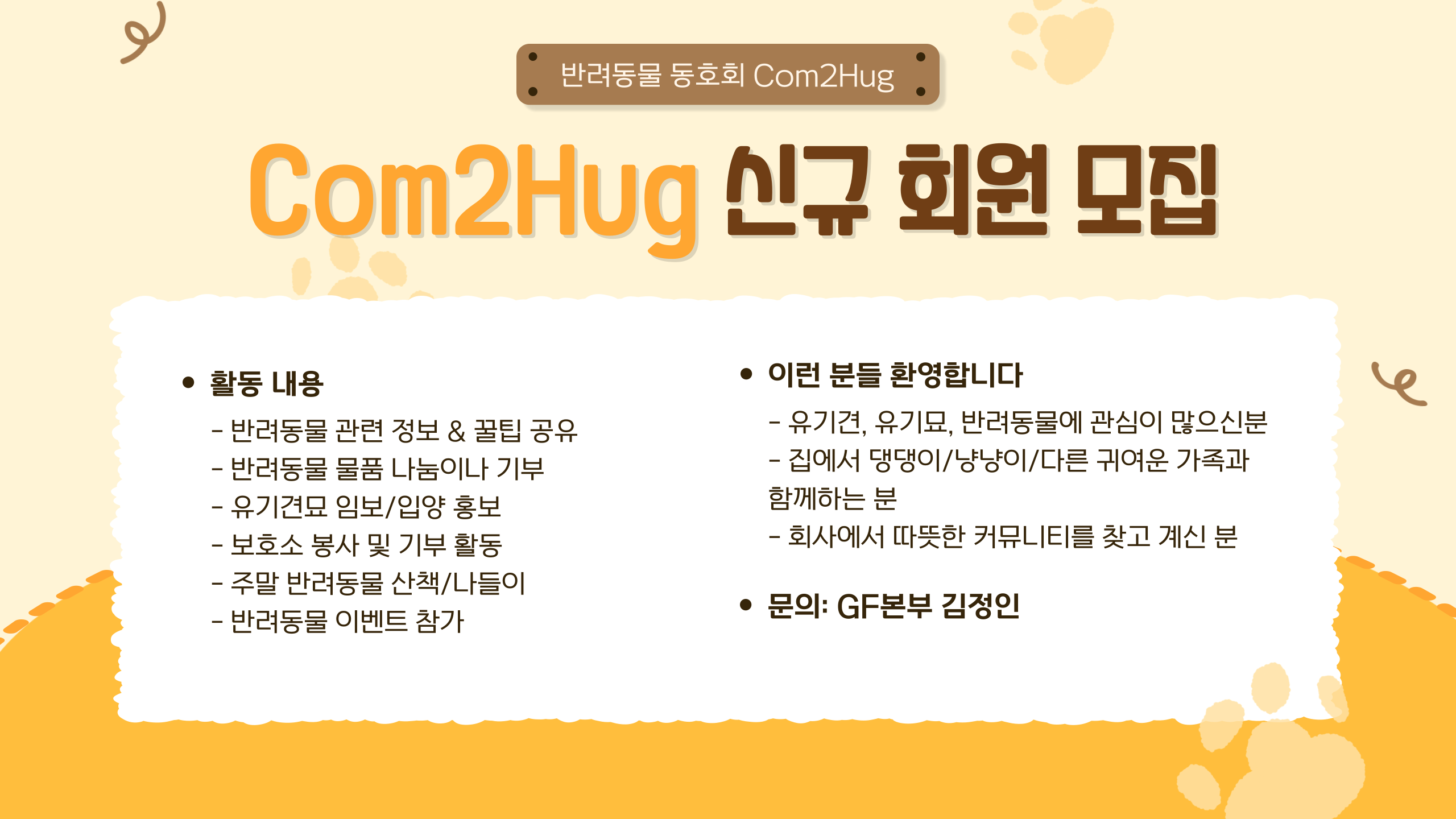 이날 열린 컴친소2 유기견묘편에서는 이처럼 다양한 이야기가 오갔다. 누군가는 안락사 직전의 강아지를 가족으로 맞이했던 경험을, 또 누군가는 길 위의 고양이를 구조했던 순간을, 다른 이는 유기동물 보호센터 현장에서 느낀 안타까움을 나눴다. 그리고 점차 “우리가 더 구체적으로 할 수 있는 실천은 무엇일까?”라는 질문으로 이어졌다. 각자의 경험은 달랐지만 마음은 같은 결론에 도달했다. 그 결과, 엄청난 추진력으로 유기견, 유기묘를 돕는 동호회인 Com2Hug(컴투허그) 설립이 추진됐고 이날 모인 사우들은 기쁘게 참여 의사를 밝혔다. 컴투허그의 첫 걸음을 함께할 새로운 회원을 초대한다. 🐾