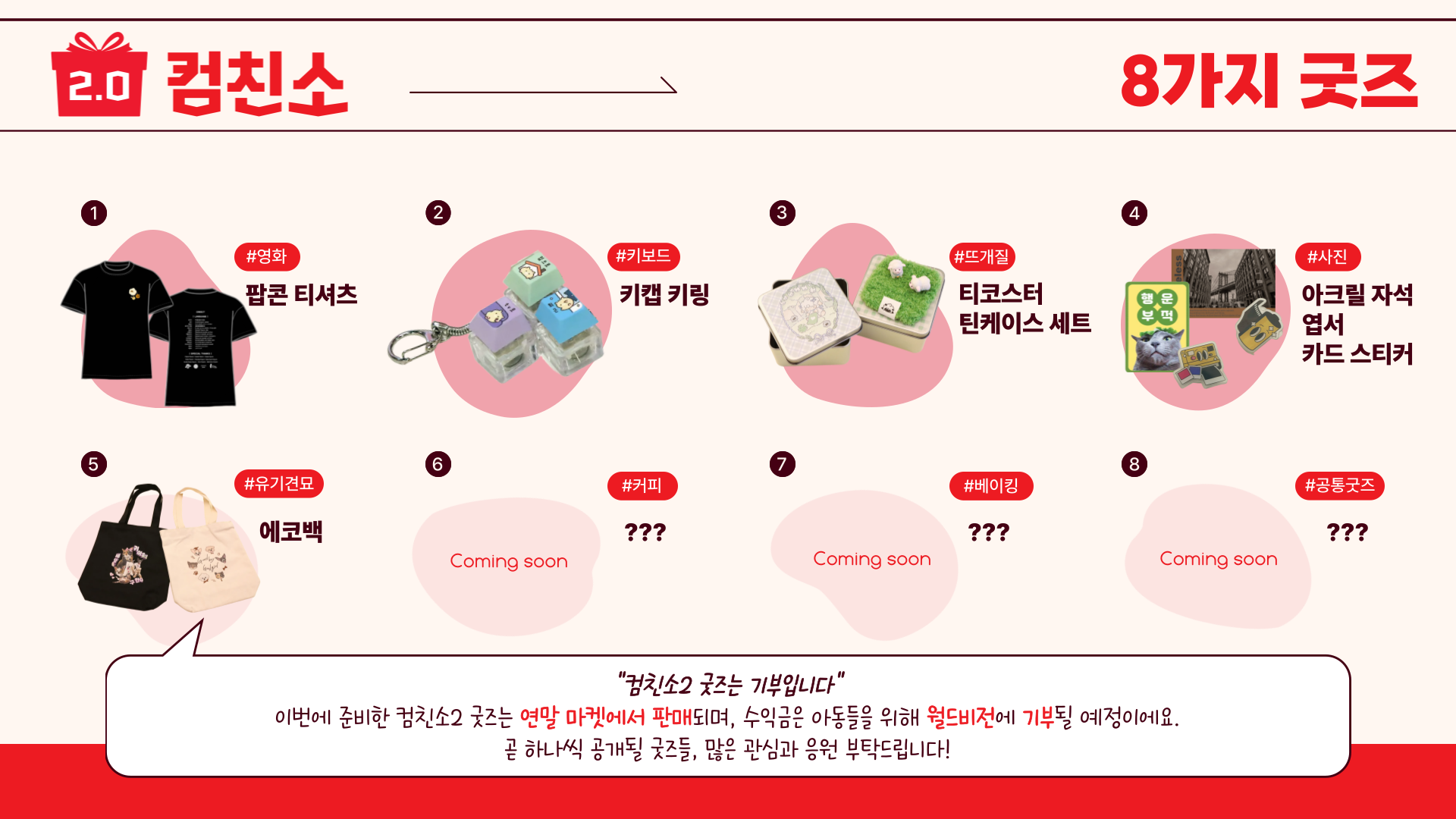 이번 굿즈 제작은 단순히 예쁜 소품이 아니라 유기견·유기묘 보호와 관심을 전하는 메시지를 담고자 했다. 그래서 누구나 보아도 미소 지을 수 있도록 귀엽고 사랑스러운 일러스트로 디자인했고, 특히 컴친소2 유기견묘편 참여자분들의 실제 반려동물이 모델이 되어 더욱 특별한 의미를 담았다. 완성된 시안들이 너무 사랑스러워서 선택하는데 어려움을 겪기도 했다. 귀여운 아이들의 모습이 담긴 에코백은 단순한 굿즈를 넘어 “사지 말고 입양하세요”, “댕냥이들은 그저 귀엽고 사랑스럽다“라는 메시지를 전하고 있다.
