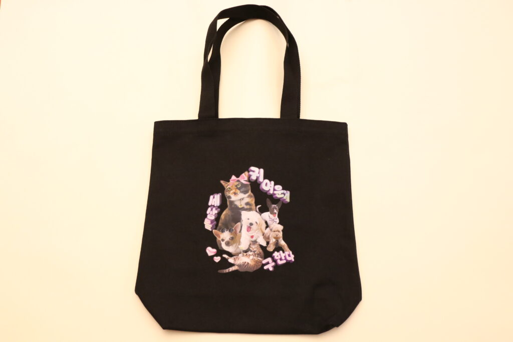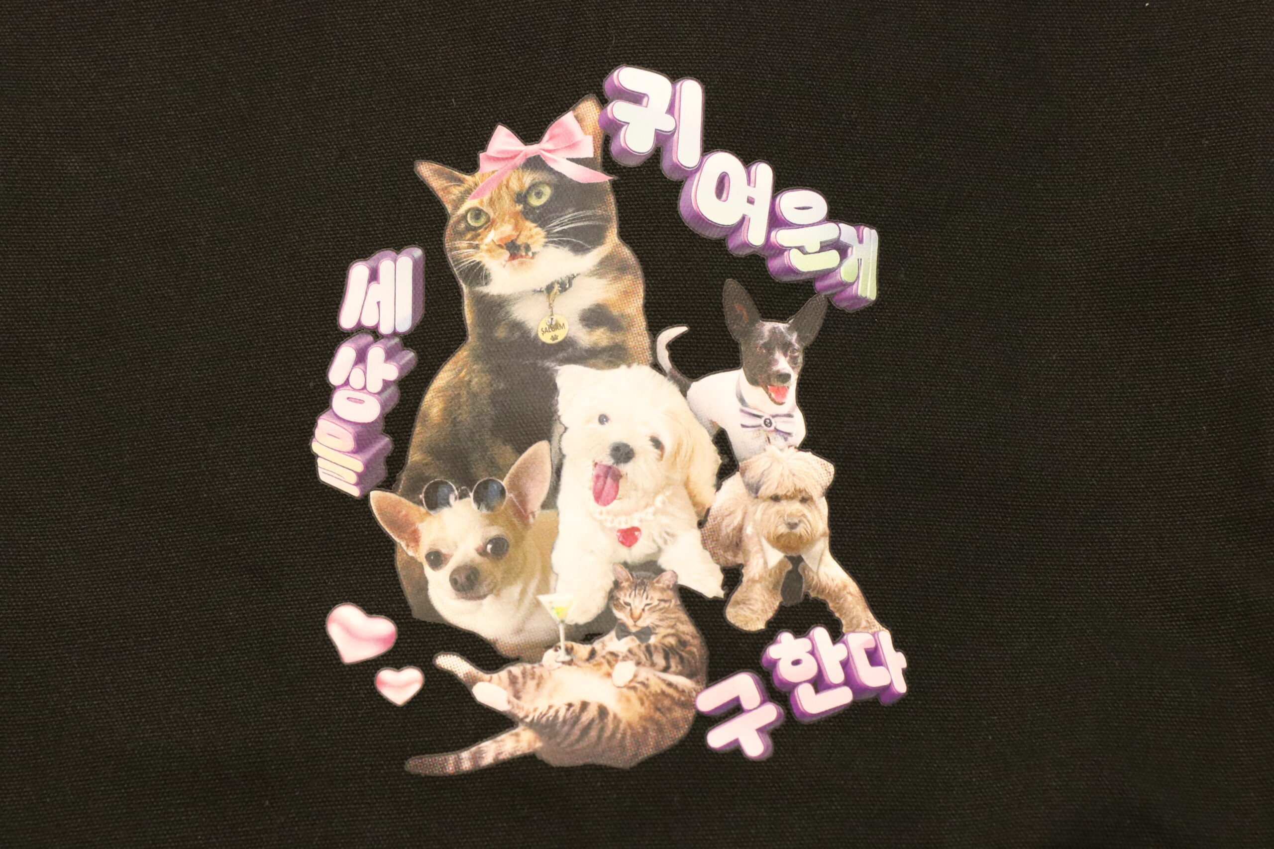 오묘: 세상의 모든 멍냥이가 귀엽고 사랑스럽다는 점이 잘 드러나게 하고자 했어요. 블랙 에코백에 “귀여운 게 세상을 구한다”라는 문구로 어필해 봤습니다.