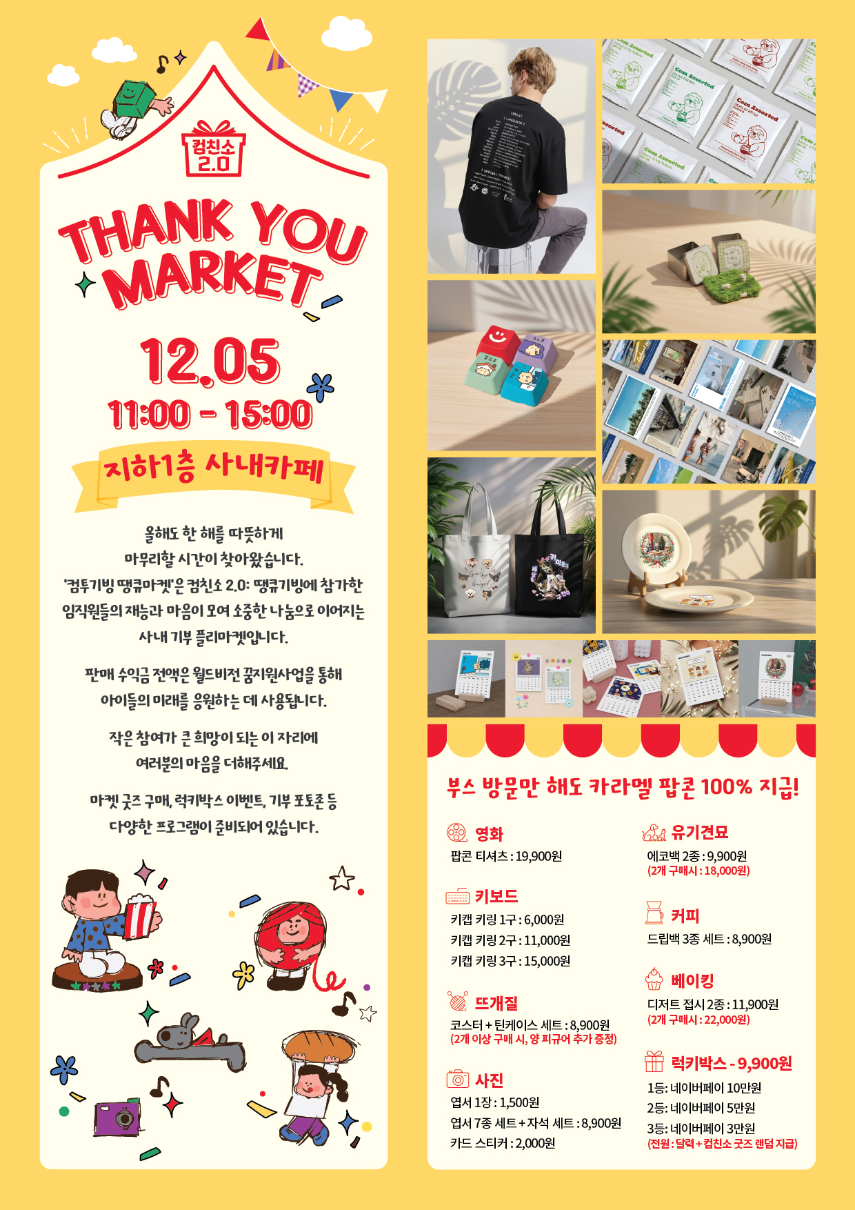 ‘컴친소 2.0: 컴투기빙’ 땡큐마켓 현장 스케치 12월 5일 금요일, 컴투스 사내 카페가 특별한 나눔의 열기로 가득 찼다. 구성원이 직접 만든 즐거움을 사회적 가치로 연결하는 ‘컴친소 2.0: 컴투기빙’ 땡큐마켓이 임직원들의 뜨거운 성원 속에 성황리에 마무리되었다. 이번 행사는 2025년을 맞아 새 단장을 마친 ‘컴투북스’ 공간에서 12월 5일 단 하루(11:00~15:00) 진행되었다. 사내 카페는 산뜻한 노란색의 컴투기빙 매대로 채워졌다. […]