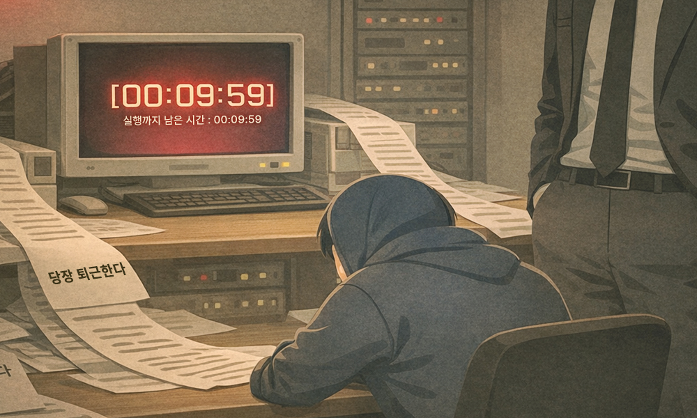 “다들…?” 혼란스러워하며 되물었다. 남자는 프린터에서 막 나온 종이 더미를 내 앞에 내려놓았다. “이 방에 들어온 사람들은 전부 한 번씩 선택을 했어.” 남자가 모니터를 가볍게 두드리며 말했다. “그리고 시스템은… 그 선택을 현실로 만들지.” 그 말이 끝나자마자 모니터의 붉은 글씨가 바뀌었다.