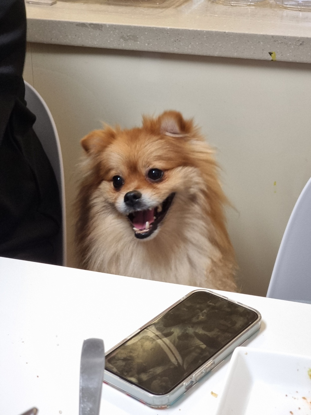 식초는 간식을 먹을 때마다 꼭 콧탱(코 인사) → 손 → 뽀뽀 순서로 인사를 해요. 😂 더 먹고 싶을 땐 밥그릇을 바닥에 던져서 의사를 표현하기도 해요. 한 번은 슬로우 피더 도자기 그릇을 던져 깨뜨리고 조각을 씹어 먹으려 해서, 제가 CCTV로 보고 깜짝 놀라 급히 집으로 달려간 적도 있었어요. 😱