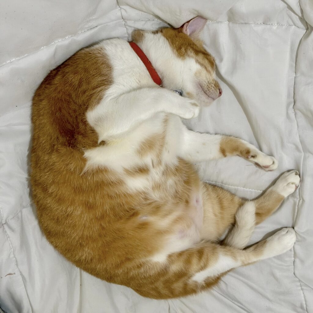 처음에는 농수로에 빠져 있던 걸 동물보호협회가 구조했고, 그 후 저희가 입양했어요. 입양 초기에는 복막염과 범백혈구감소증 때문에 힘든 시기가 있었지만, 결혼 자금을 써서 치료에 전념한 덕분에 지금은 건강하고 활발한 ‘행복한 동동이’가 되었답니다. 🙂