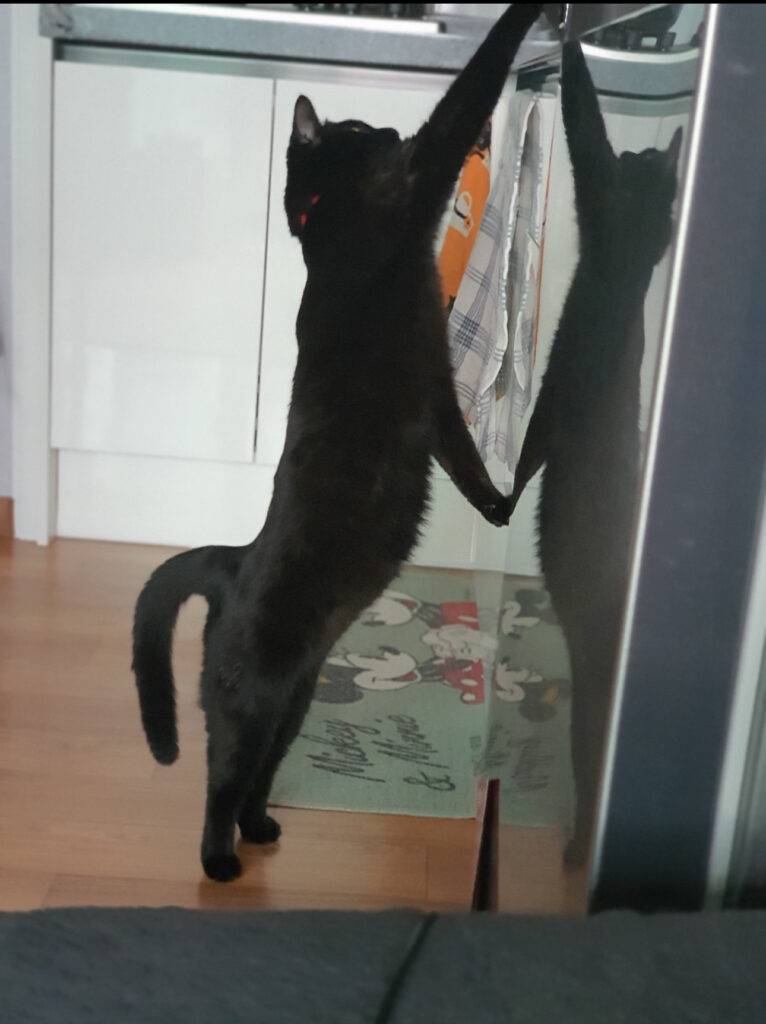식초의 외모적 특징은 새까만 털과 초록빛 눈이에요. 아기 때는 온몸에 하얀 솜털이 가득해서, 노란 눈을 한 작은 고슴도치처럼 보였답니다. 😆 스트레칭할 때는 길이가 거의 1미터에 달해서 정말 흑표범처럼 멋져요!