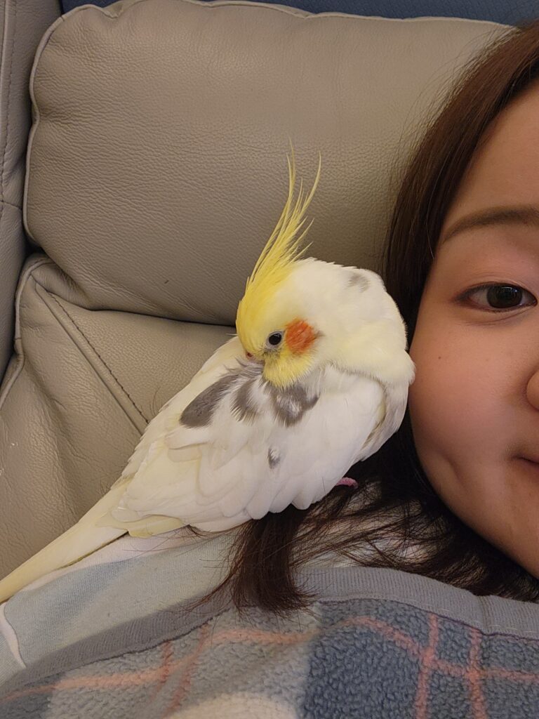 왕관앵무의 이름은 태국어로 ‘카놈찌입’이라고 부르는데, ‘슈마이(딤섬의 일종)’라는 뜻이에요. 볼은 밝은 주황색, 몸에는 노란색 털이 섞여 있어서 부드럽고 통통한 슈마이 같아 이렇게 지었답니다. 왕관앵무의 평균 수명은 약 10~15년인데, 지금 카놈찌입이는 4살쯤 되었어요. 처음 만났을 때부터 제게 다가와 머리를 내어주더라고요. 보통 앵무새는 낯을 가리는 편인데, 처음부터 그런 모습이라 ‘이건 운명이다!’ 싶었죠. 😆 고민 끝에 세 번이나 만나 본 후 결국 입양하게 되었어요. 당시 부산에 살다가 인천으로 이사 오기 전이었는데, 먼 길을 함께 이사 온 아이라 더 소중해요. 왕관앵무 수컷은 노래를 잘 부르는 걸로 유명해서 저도 카놈찌입이에게 노래를 가르쳐 주고 있어요. 물론 끝까지는 못 부르지만… 그래도 귀엽잖아요! ㅎㅎㅎ