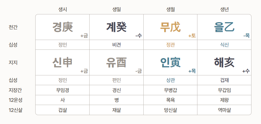 조금 쉽게 설명하자면, 사주팔자는 게임 캐릭터를 생성할 때 무작위로 주어지는 8개의 초기 스탯과 같습니다. 각 스탯의 수치와 유닛 간의 조합이 나만의 독특한 플레이 스타일을 만드는 것처럼, 사주와 나의 기질 또한 긴밀하게 연결되어 있죠.
