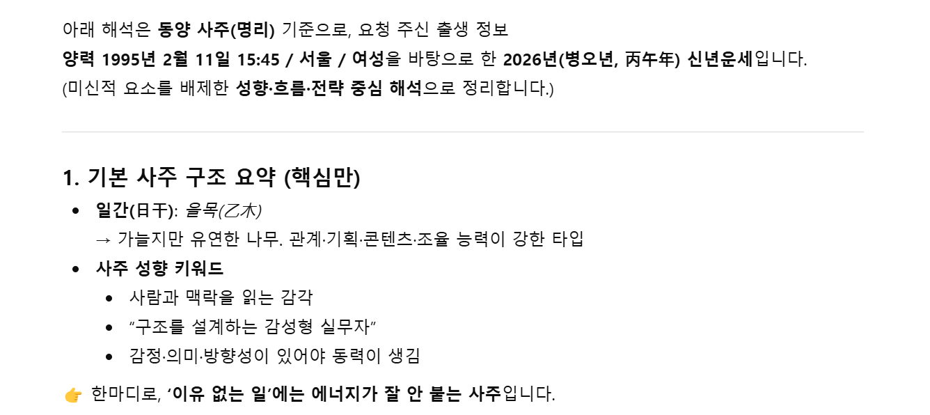 여러 조건을 입체적으로 따져야 하는 신년 운세나 특정 연도의 변화 시기는 AI가 논리적 오류를 범할 확률이 높으므로, 구체적인 수치보다는 전체적인 흐름만 가볍게 참고하세요.