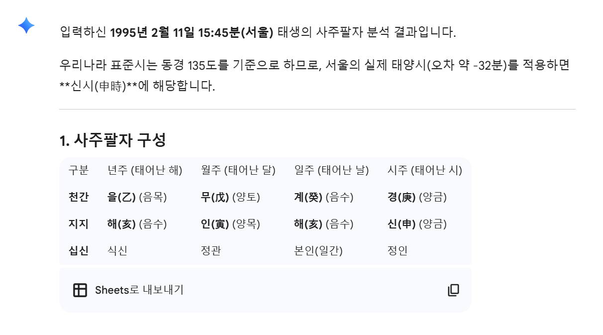 “특정 오행이 많으면 이런 성향이다”와 같은 단순 패턴 분석은, 정형화된 데이터가 풍부해 AI가 비교적 안정적으로 잘 맞히는 영역입니다. “내 사주의 오행 균형은 어때?”, “타고난 내 강점은 뭐야?”처럼 구체적이면서도 일반적인 성향을 물어보고 그 내용을 참고하세요.