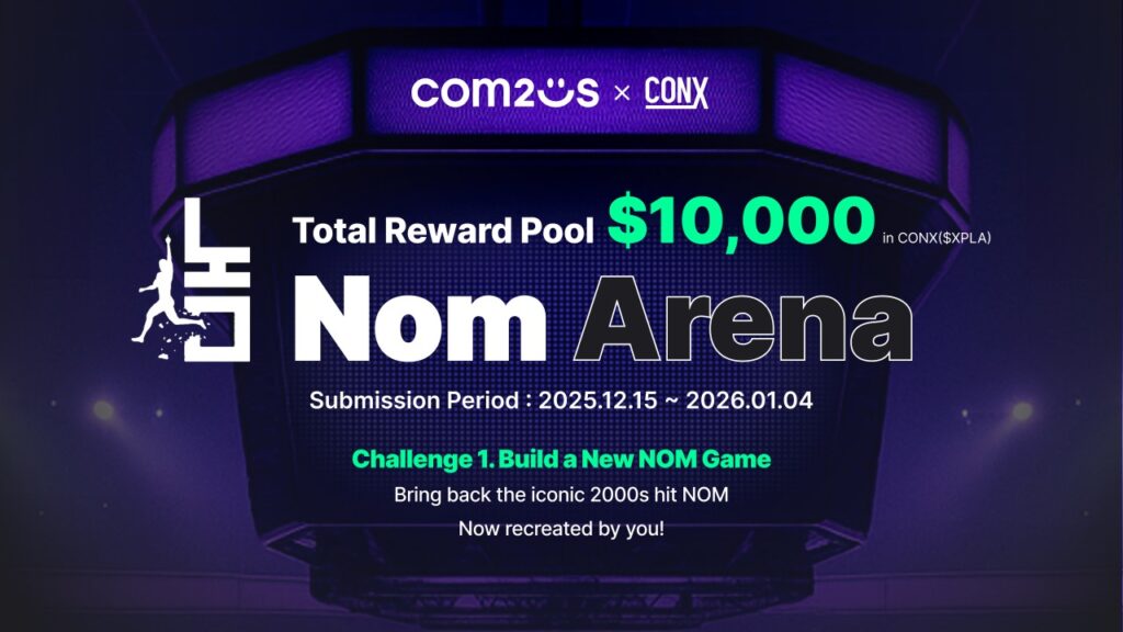 The first initiative under CONX Arena is Nom Arena一a game jam program co-hosted with Com2uS Holdings, a leading global game publisher and core partner of the CONX ecosystem. For the duration of the program, Com2uS Holdings will fully open the usage rights of its flagship IP, NOM, enabling creators worldwide to freely reinterpret and build upon the original game. Participants need only submit a creative game development proposal and demo video using the ‘Nom’ IP. To encourage a more creative development environment, production across all platform formats—mobile, PC, web, and mini-apps—is permitted, and participants are strongly recommended to utilize AI. Registration is open until the 4th Jan. Detailed recruitment guidelines can be found on the CONX Arena website.
