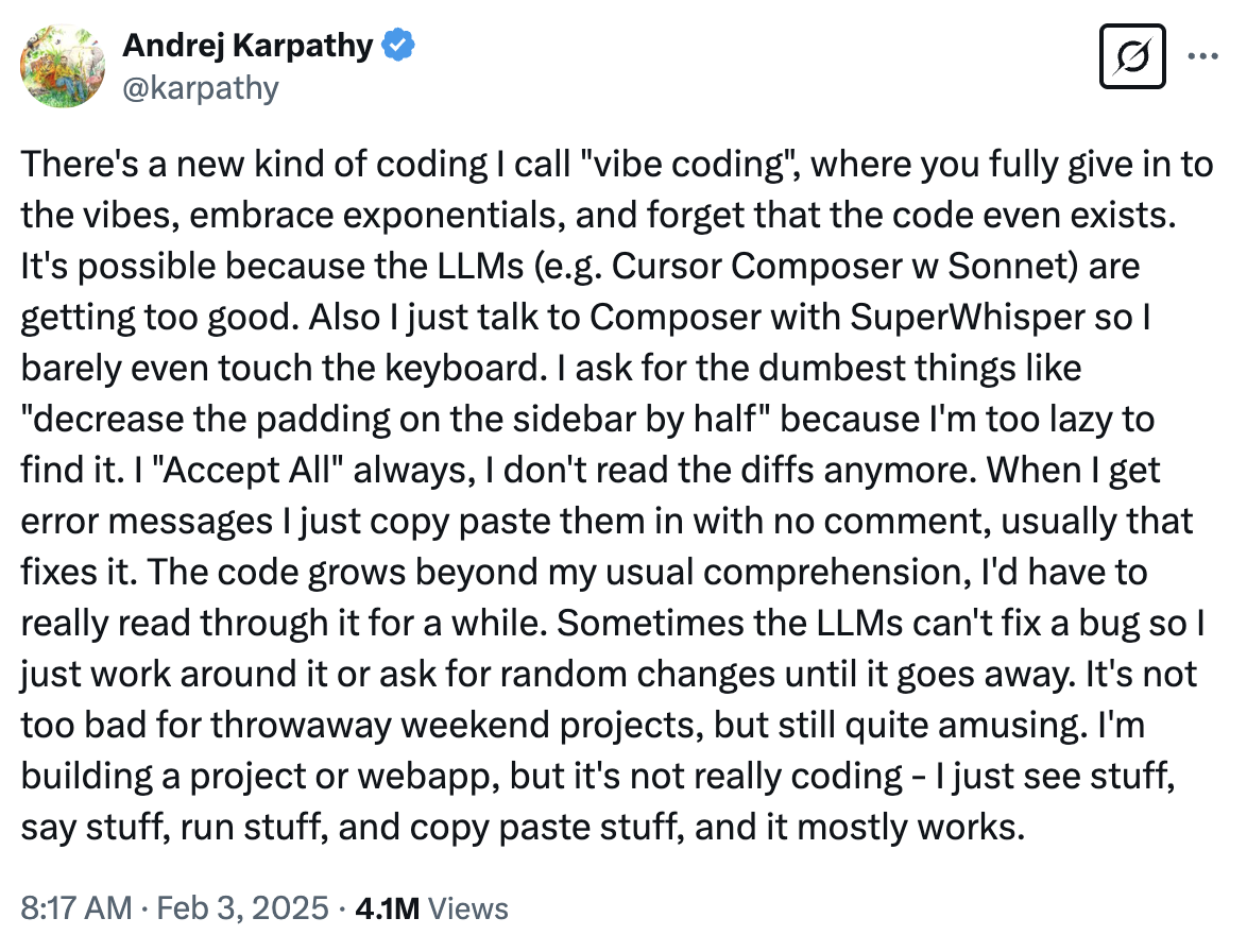 2025년 2월, Andrej Karpathy가 X(트위터)에 짧은 글을 올렸다. “바이브 코딩(Vibe Coding)”이라는 표현이었다. AI에 완전히 몸을 맡기고, 코드가 존재한다는 사실조차 잊어버리는 새로운 개발 방식. 그 글은 며칠 만에 수백만 건의 조회 수를 기록했고, 이후 뉴욕타임스·가디언·아스 테크니카가 연달아 보도했다. 콜린스 영어사전은 2025년의 단어로 ‘vibe coding’을 선정했다.