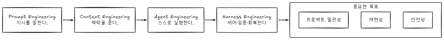 중요한 점은, 이 네 단계가 서로를 대체하는 관계가 아니라 레이어처럼 쌓이는 관계라는 것이다. 하네스 엔지니어링을 도입하더라도 좋은 프롬프트와 정교한 컨텍스트는 여전히 필요하다. 각 단계는 AI가 수행할 수 있는 역할의 확장이자, 이전 단계의 한계를 보완하는 새로운 층이다.