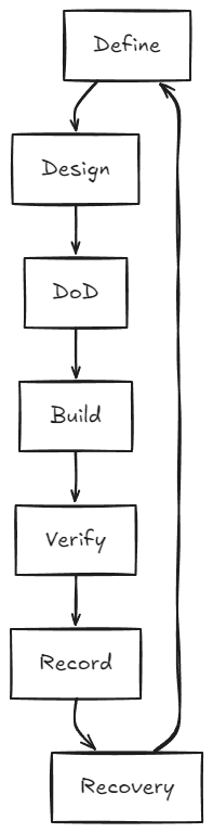 AI와 협업하는 개발 환경에서는 기존 개발 프로세스만으로 충분하지 않다. AI는 코드 생성 능력은 뛰어나지만, 문제 정의와 구조 유지에는 약점이 있기 때문이다. 이를 보완하기 위해 다음과 같은 7단계 프로세스를 정의해 사용한다.