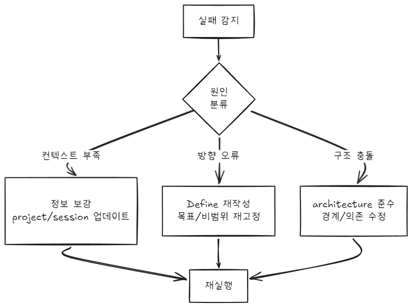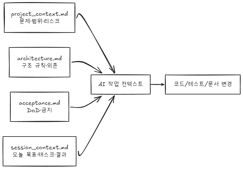 앞의 세 파일(`project_context.md`, `architecture.md`, `acceptance.md`)은 프로젝트 전체에 걸쳐 고정되는 컨텍스트이고, `session_context.md`는 세션 단위로 갱신되는 휘발성 컨텍스트다. 세션 컨텍스트는 짧아야 하고, 프로젝트 컨텍스트는 고정되어야 한다. 이 파일들을 기반으로 각 단계를 어떻게 하는지 설명한다.