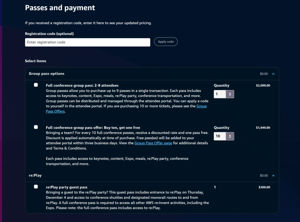 참가를 위해서는 Full Pass($2,099, 한화 약 300만 원 이상)를 구매해야 한다. (파티 전용인 re:Play 게스트 패스와 혼동하지 말 것). 패스 구입이 완료되면 세션 예약이 활성화된다. 인기 세션은 순식간에 마감되므로 오픈 즉시 예약하는 것을 추천한다. 예약에 실패했더라도 현장에서 줄을 서서 입장하는 ‘Walk-up’ 제도를 활용할 수 있다.
