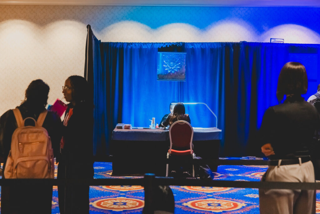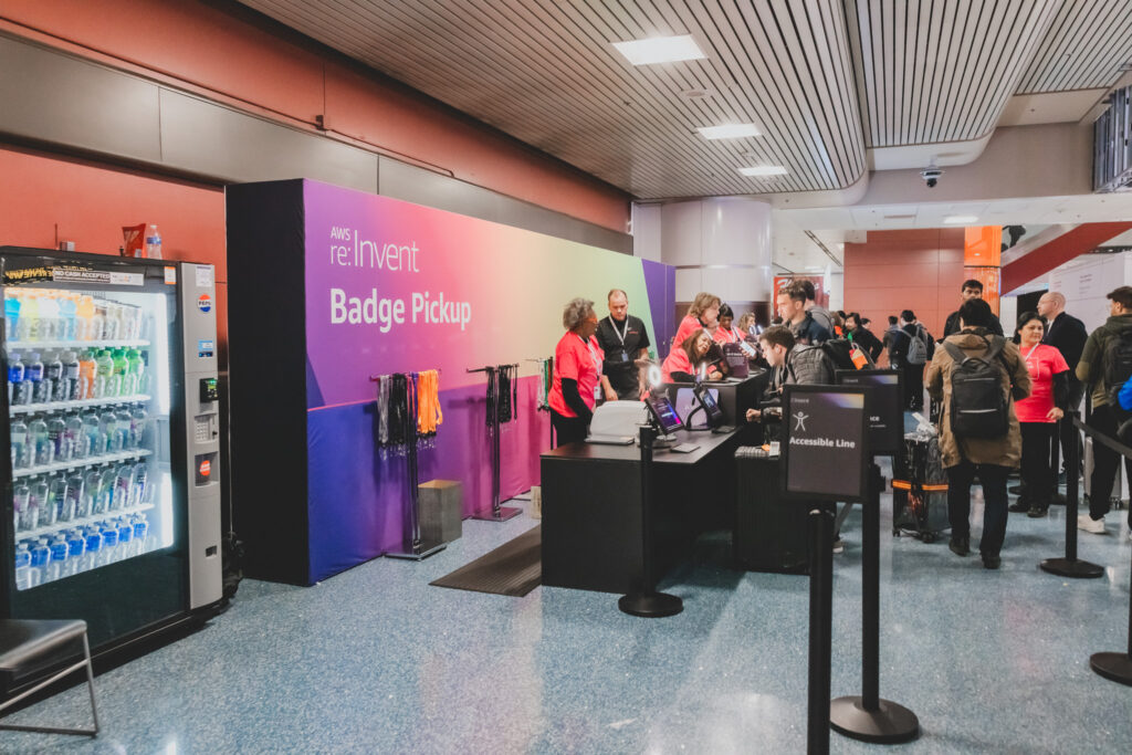 AWS re:Invent 입장권인 뱃지를 가장 먼저 수령해야 한다. 뱃지 없이는 행사장 입장이 불가능하다. 라스베이거스 공항과 주요 호텔에서 수령할 수 있으며, 공항에서는 수화물을 기다리는 시간에 빠르게 수령할 수 있었다. 뱃지 수령을 위해서는 등록 QR코드와 신분증이 필요하다.