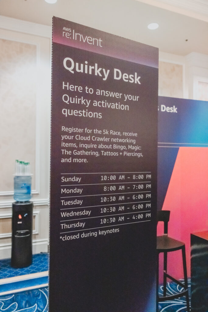 AWS re:Invent 기간 중 5K 마라톤이 개최된다. 참가를 위해서는 Quirky Events Desk를 방문해야 한다. 선착순으로 Bib이 제공되지만, 당일 현장에서도 등록이 가능하다. 라스베이거스 도로를 달릴 수 있는 재미있는 이벤트다. 각 호텔의 셔틀 탑승장에서 오전 5시 15분에 셔틀을 타고 Mandalay Bay로 이동할 수 있으며, 짐 보관과 음료, 간단한 먹거리가 제공된다.