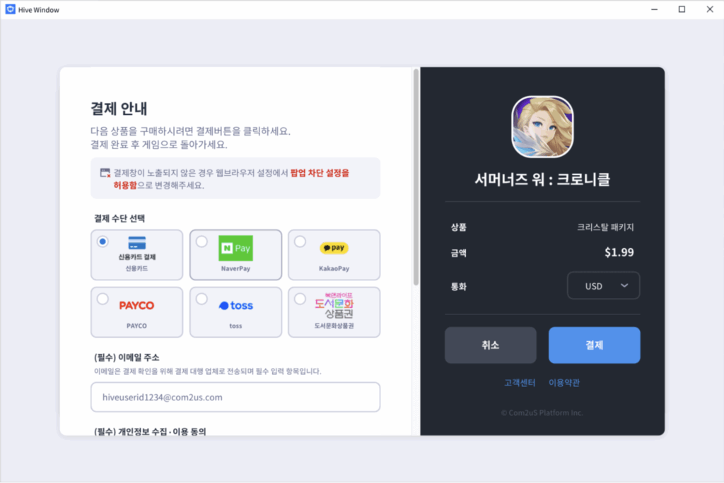 Hive 빌링의 PG 결제는 검증된 솔루션인 PortOne과 Xsolla 페이먼트를 지원한다. 국내외 다양한 간편 결제와 로컬 결제 수단을 심리스(Seamless)하게 연결하며, 복잡한 본인 인증이나 별도 프로그램 설치 없이 유저가 결제를 결심한 바로 그 순간 거래가 완료되도록 설계되었다. 유저의 IP 주소를 기반으로 해당 국가의 통화와 결제 옵션이 자동으로 설정되어, 전 세계 유저에게 최적화된 구매 경험을 제공한다.